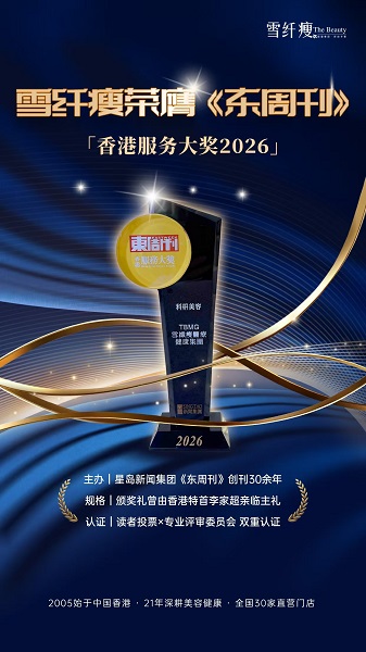 2026年3月31日,备受业界瞩目的“香港服务大奖2026”颁奖典礼在港隆重举行。雪纤瘦凭借在美容健康领域的卓越服务和良好口碑,荣获由《东周刊》颁发的“香港服务大奖2026”。该奖项以严格评审机制与广泛行业影响力著称,旨在表彰在服务质量、客户体验及行业贡献方面表现突出的品牌。
