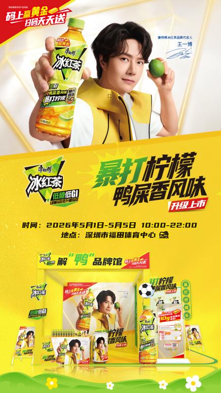 为配合新品上市,康师傅冰红茶将于2026年5月1日至5月5日,每日10:00-22:00,在深圳市福田体育中心打造「解“鸭”品牌馆」线下快闪活动。